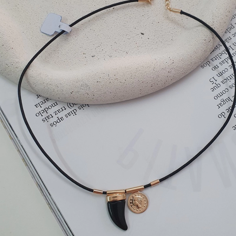 Não perca a chance de brilhar com o Choker Couro Dente e Moeda! Adicione um toque de elegância ao seu estilo e destaque-se em qualquer ocasião!
