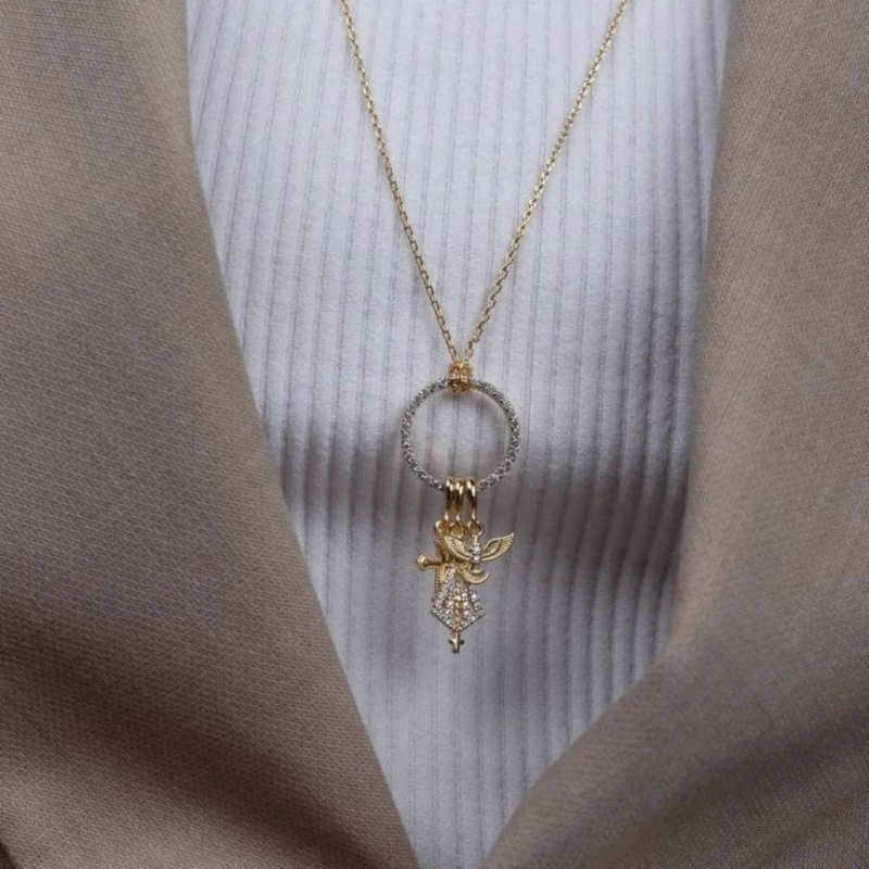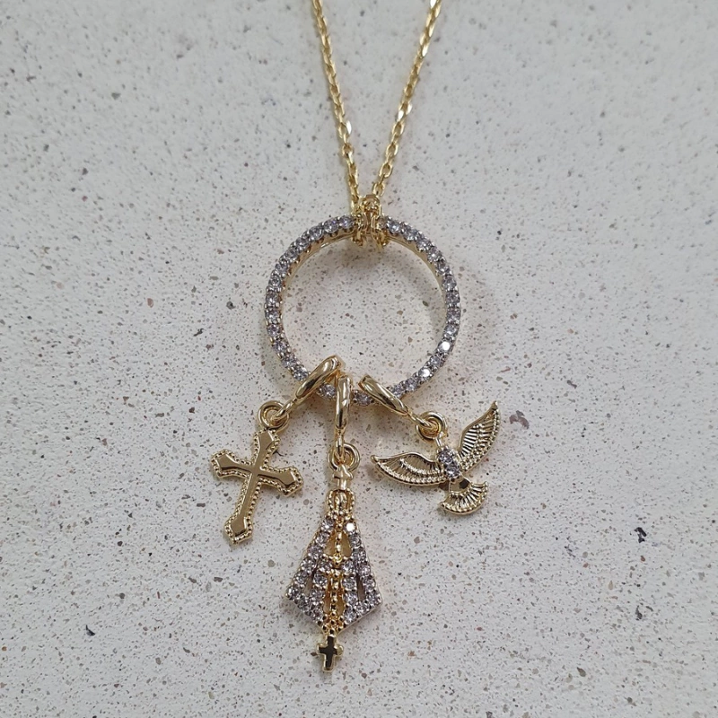 Este colar patuá delicado, com uma elegante corrente de 70 cm, é adornado por uma argola cravejada de zircônias cristal que capta a luz de maneira sublime. Os pingentes representam a Nossa Senhora Aparecida, o Divino e um crucifixo, todos banhados a ouro e cravejados com zircônias, trazendo um toque de sofisticação e espiritualidade ao seu visual.